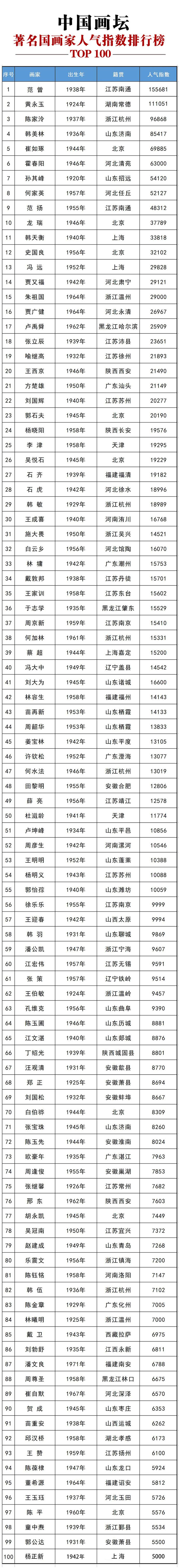 本次推出的当今画坛国画家人气指数主要依据画家取得的成就、荣誉、知名度、影响力、网络关注指数等因素,并综合参考互联网相关排行榜。